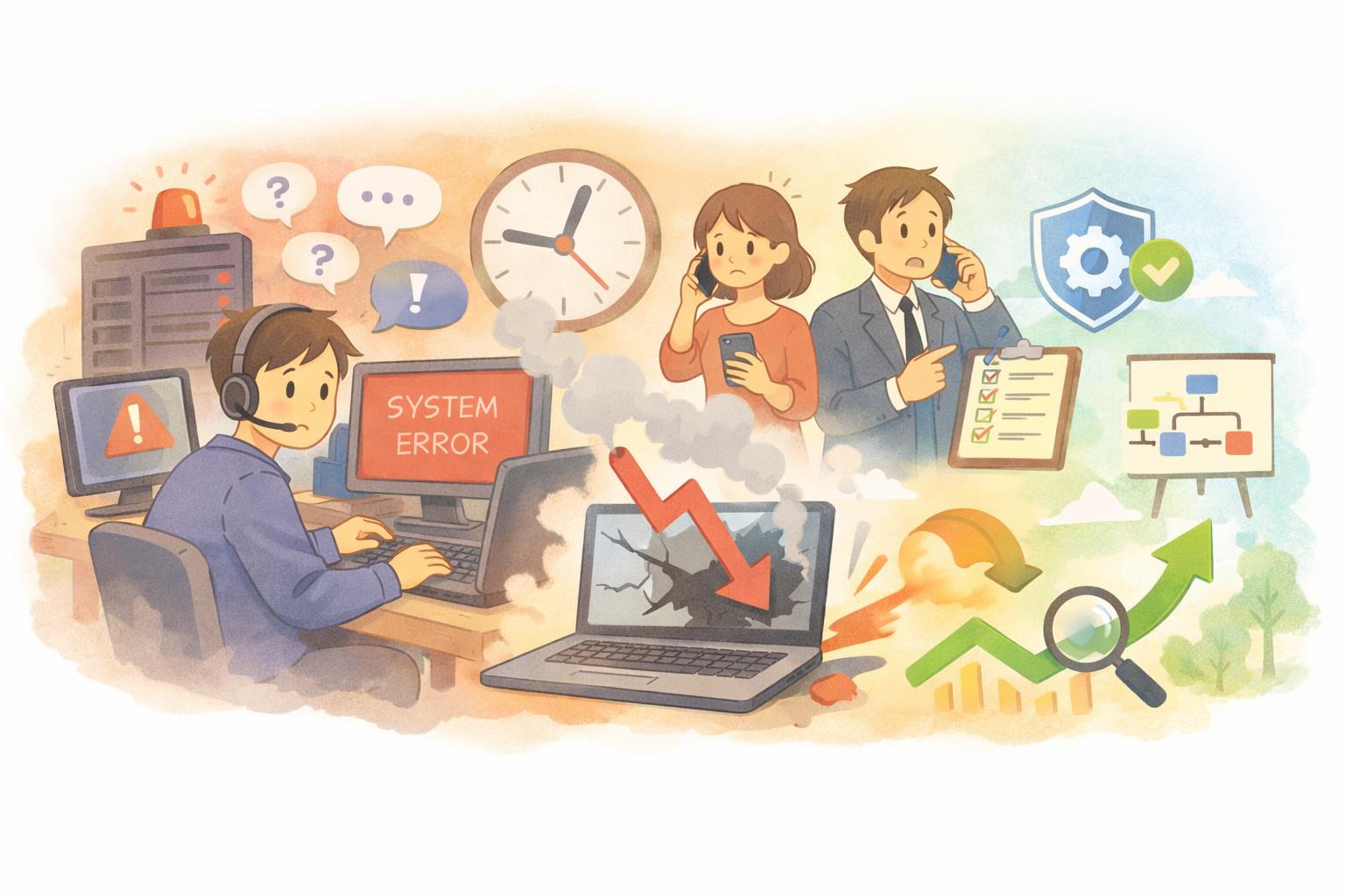 対応マニュアルは古く、役に立たない情報ばかり。休暇中のベテランエンジニアに電話が殺到し、彼がいないと何も進まないという最悪の状況が露呈しました。その結果、復旧までに丸2日を要し、顧客への説明も二転三転。憶測や不信感が広がり、多くの顧客が解約を検討する事態にまで発展し、企業の信頼は大きく損なわれました。